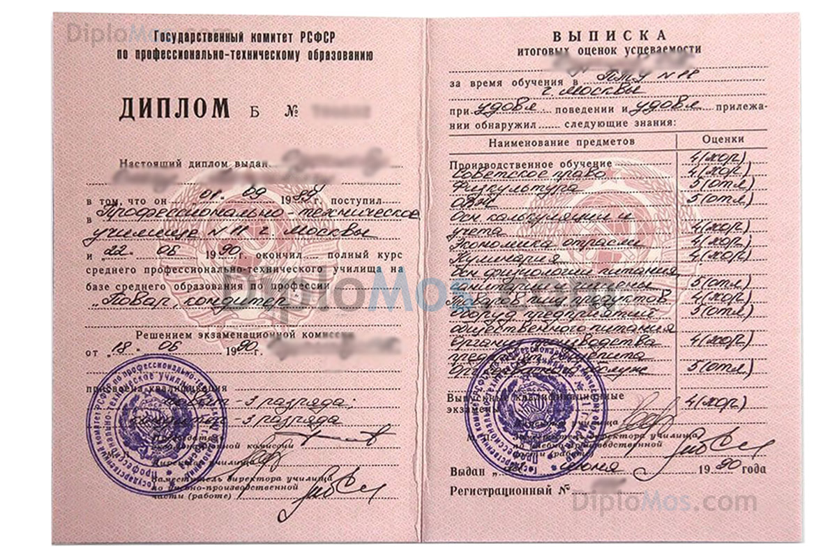 На нашем сайте Вы можете купить диплом училища (ПТУ) времён СССР, который выдавался до 1994 года включительно. При заказе можно выбрать профессию по Вашему желанию — повара, слесаря, сварщика, электрика или любую другую. Сам бланк, образовательная программа, печать, подписи — всё соответствует советским требованиям к заполнению и выбранному училищу, документ никто не отличит от настоящего. Работаем быстро, без предоплаты, с соблюдением конфиденциальности. Обращайтесь!