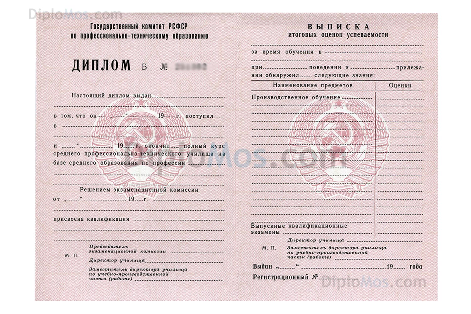 Настоящий диплом ПТУ СССР (РСФСР) заполняется профессионалами как в училищах, утверждается гербовой советской «мокрой» печатью и подписью директора училища, максимально похожими на оригинальные. При желании сделаем копию по Вашему образцу (если есть) и с Вашими данными.